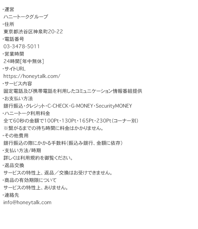 本規約は、ハニートーク(以下「本サービス」といいます)をご利用いただく会員が遵守すべきことを規定しています。